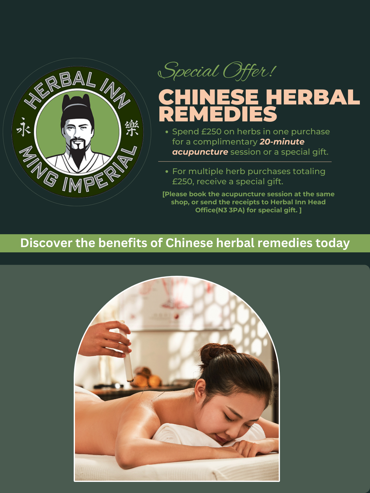 Herbal Inn, established since 1989, is proud to be one of the earliest and prominent Traditional Chinese Medicine (TCM) companies in the United Kingdom to provide acupuncture, massage, cupping and other treatments. Such treatments are also combined with quality-controlled TCM products.